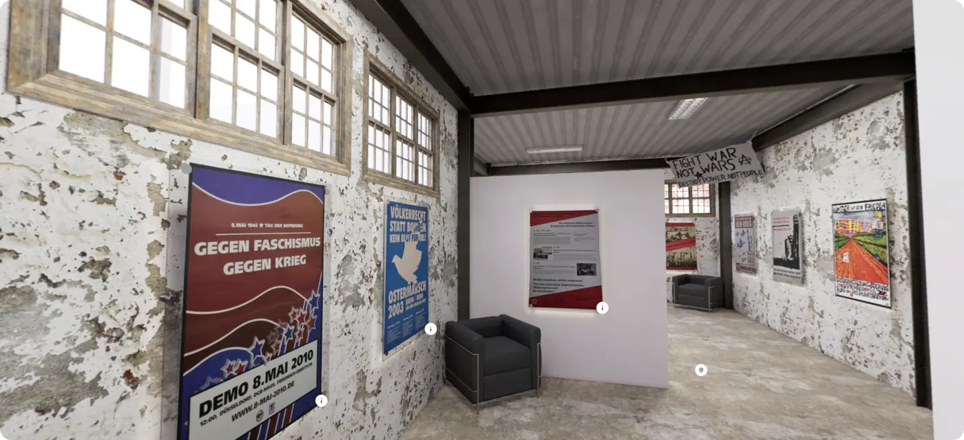 Die Ausstellung thematisiert Plakate von lokalen, aber auch bundesweiten Initiativen und Gruppen. Es sind Plakate zu wiederkehrenden Demonstrationen, die Demo zum 8. Mai oder der Ostermarsch, aber auch Kulturveranstaltungen, allgemeinen und spezifischeren Veranstaltungen und Aktionen vertreten.