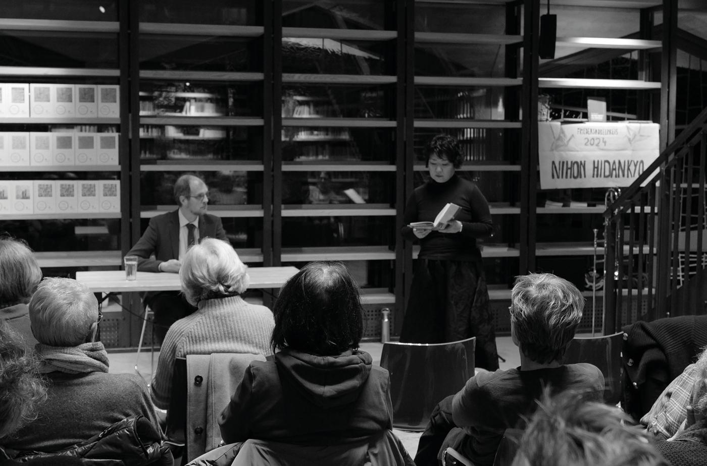 The event to mark the awarding of the Nobel Peace Prize to Nihon Hidankyo marked the end of the 2024 event year for us [1] . In a well-attended Fritz Bauer Library, Rima Ideguchi read passages from the eyewitness account of her grandfather Shigemi Ideguchi, who survived the atomic bombing of Hiroshima on 6 August 1945. In his book, which was published in German in 2015 , Ideguchi describes the destructive power of the atomic bomb, the resulting devastation and the horrific injuries suffered by the survivors. He describes the radiation of his own body, hair loss and burns and the stigma attached to the survivors in a way that is as poetic as it is disturbing, yet still linked to the hope „that the footsteps of the military boots that ran with me on the evening of 5 August will become the sound of the peace march.“ Following this plea for peace, Dr Gabriele von Wahlert and Dr Ingrid Farzin from IPPNW Bochum described the need to disarm nuclear weapons.